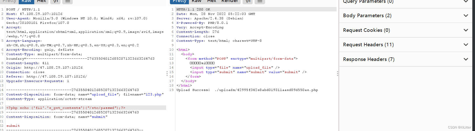 于是我就想怎么开始绕disable_functions了,然而却没什么思路。看了大师傅的wp,发现其实函数禁用的并不全。还有file_get_contents函数可以用,但是上传对上传包的内容有限制,进行字符串拼接绕过,当然也可以用十六进制绕过。