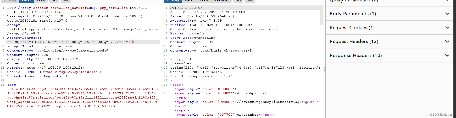 在主页面的php代码中我们是可以传session的,另外还有ini_set函数,我们可以控制修改php_ini的参数配置,没错,这里存在session反序列化漏洞。编写攻击ssrf的poc: