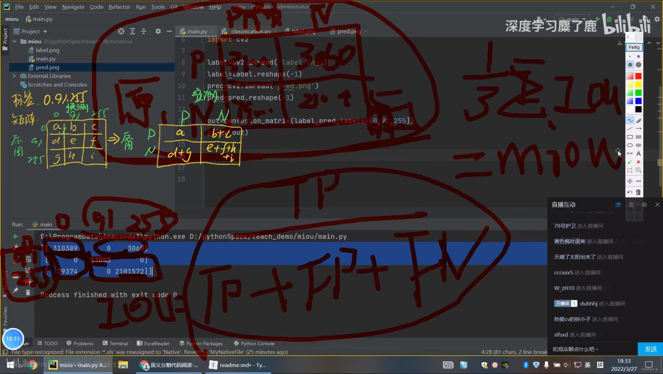 混淆矩阵:from sklearn.metrics import confusion_matrix ,miou的计算大概思路↓以0-0为例: