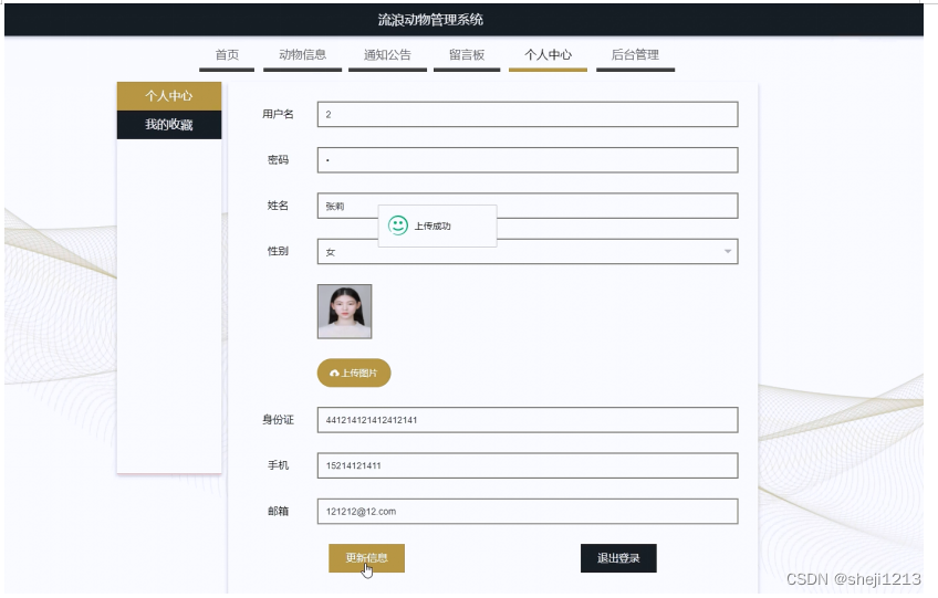 个人中心,在个人中心页面通过填写用户名,密码,姓名,性别,身份证,手机,邮箱等内容进行更新信息操作,还可以对我的收藏进行详细操作;如图5-4所示。