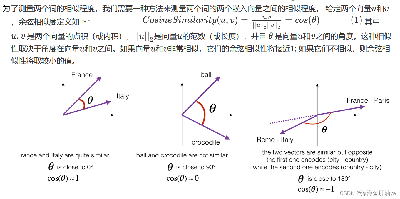 上图两个向量之间角度的余弦是衡量它们有多相似的指标,角度越小,两个向量越相似。