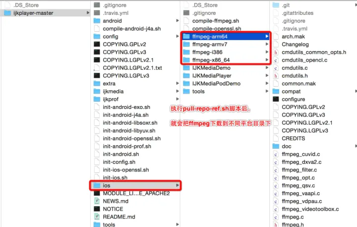 pull-repo-ref.sh脚本作用:下载B站托管的github上的FFmpeg分支,分别根据不同的架构平台创建对应的目录,把ffmpeg源码放置不同架构平台的工作目录中- // B站自己托管站github的FFmpeg