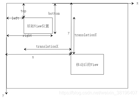 需要注意的是,View在平移的过程中,top和left表示的是原始左上角的位置信息,其值并不会发生改变,此时发生改变的是x、y、translationX和translationY这四个参数。