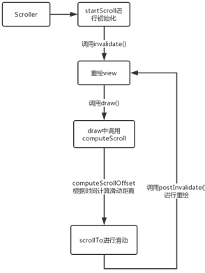 调用startScroll方法后,Scroller内部其实什么都没有做,它只是保存了传递的参数。需要注意的是这里的滑动指的是View内容的滑动而非View本身位置的改变。使得View弹性滑动的是invalidate方法,该方法会导致View的重绘,在View中draw方法又会去调用computeScroll方法,而该方法通过调用Scroller的方法进行滑动,在通过调用postInvalidate方法进行二次重绘,以此类推。