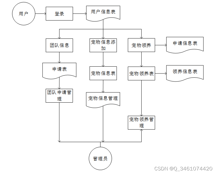 宠物领养系统底层数据流图主要描述系统底层模块的数据流、数据载体、数据处理、外部实体的具体交互。本系统就是管理员和普通用户在用户管理、宠物信息、宠物领养、团队活动管理等模块上的数据交互。