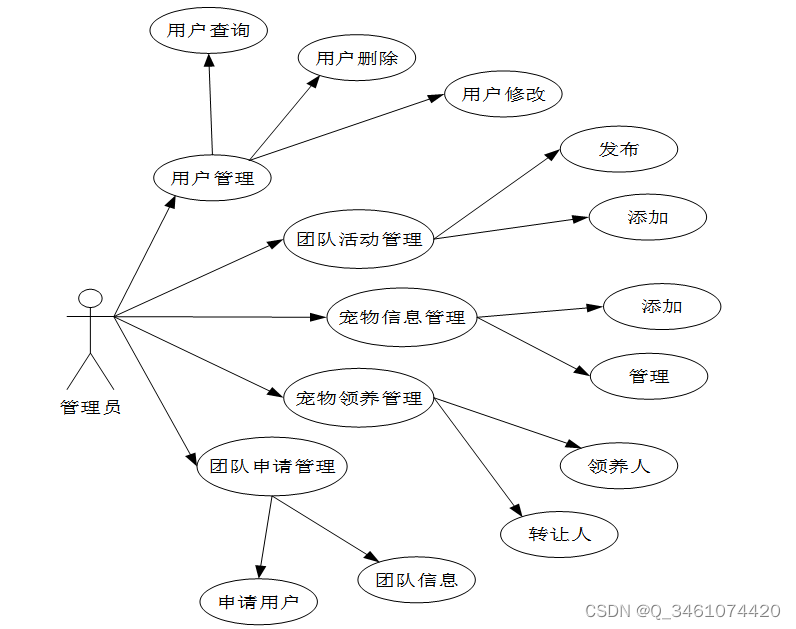 2.管理员主要负责用户管理、宠物信息管理、宠物领养管理、团队信息管理,下图所示描述管理员的用例图。