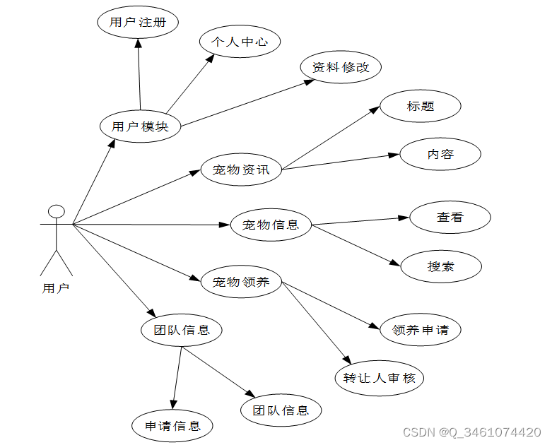 1.普通用户主要使用系统进行宠物领养以及入团申请,下图所示为普通用户的用例