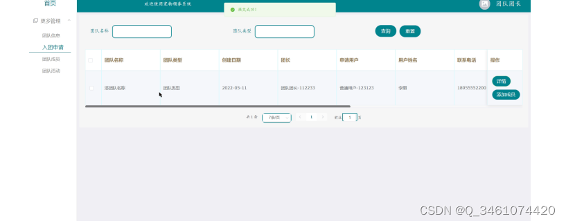 团队申请管理:对用户的入团申请进行审核管理。