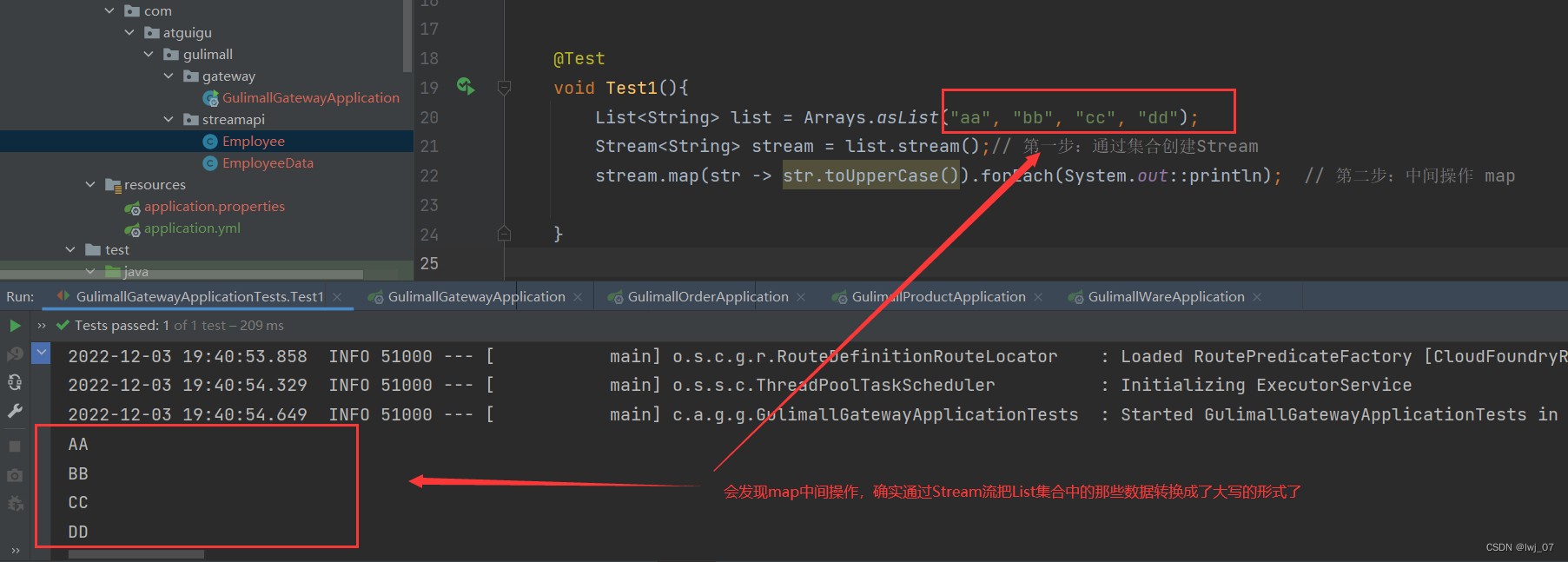stream = list.stream();// 第一步:通过集合创建Stream - stream.map(str -> str.toUpperCase()).forEach(System.out::println); // 第二步:中间操作 map