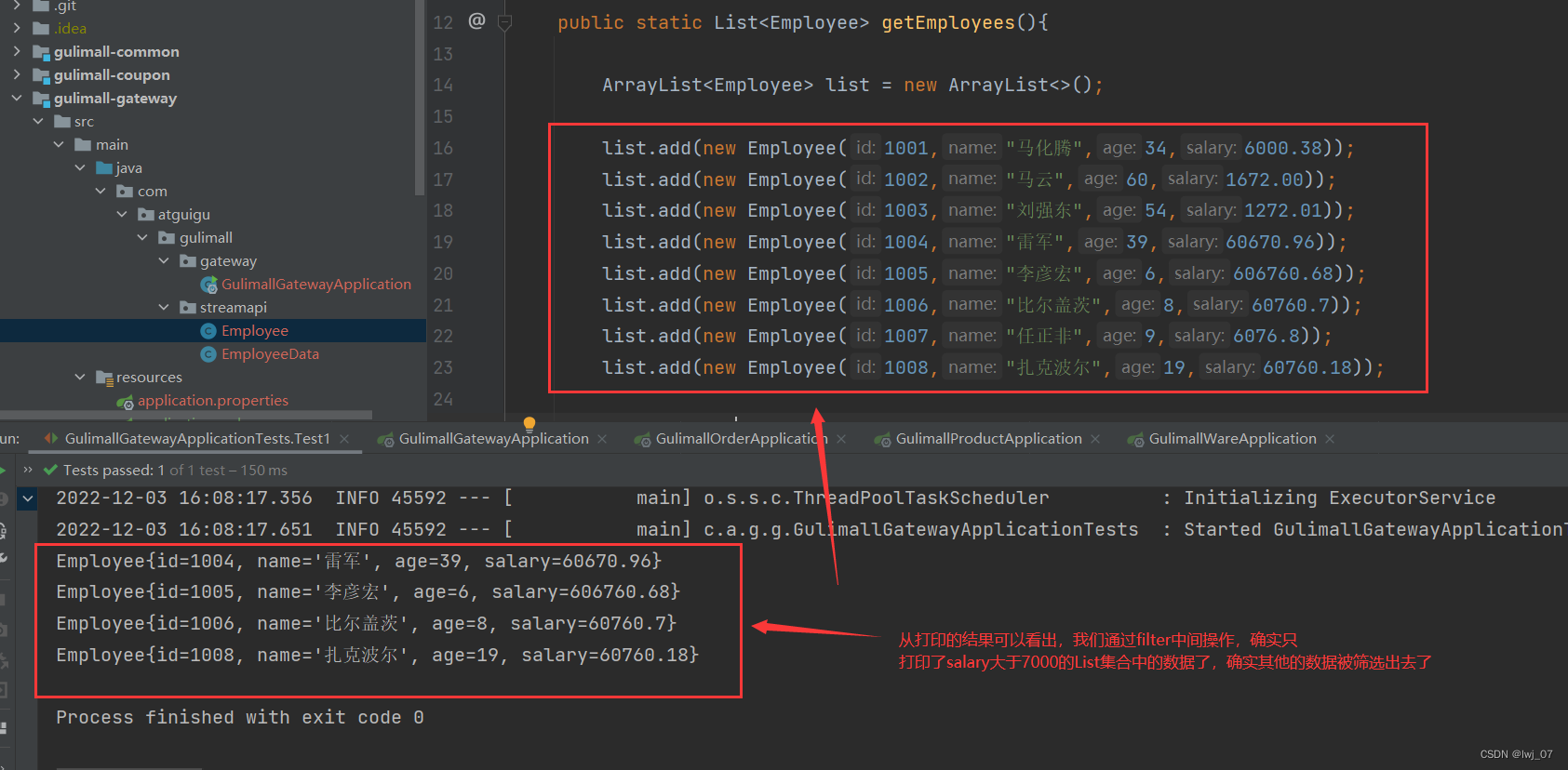 list.add(new Employee(1001,"马化腾",34,6000.38)); list.add(new Employee(1001,"马化疼",34,58.0)); list.add(new Employee(1002,"马云",60,1672.00)); list.add(new Employee(1003,"刘强东",54,1272.01)); list.add(new Employee(1004,"雷军",39,60670.96)); list.add(new Employee(1005,"李彦宏",6,606760.68)); list.add(new Employee(1006,"比尔盖茨",8,60760.7)); list.add(new Employee(1007,"任正非",9,6076.8)); list.add(new Employee(1008,"扎克波尔",19,60760.18));