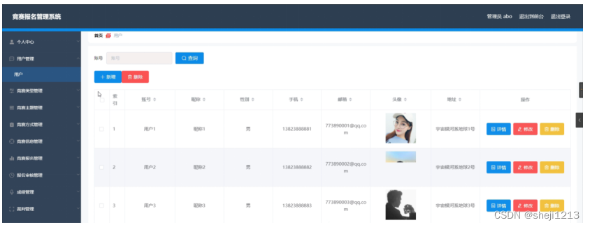 用户管理,在用户管理页面中可以查看索引、账号、昵称、性别、手机、邮箱、头像、地址等内容,进行详情、修改或删除等操作;如图4-7所示。