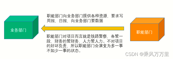 职能部门掌控资源,还要控制各个业务部门的状态. 要求写周报,月报等, 财务,人力资源. 部门之间沟通不畅和不同领导理解问题不一致,导致一个个的管理孤岛.