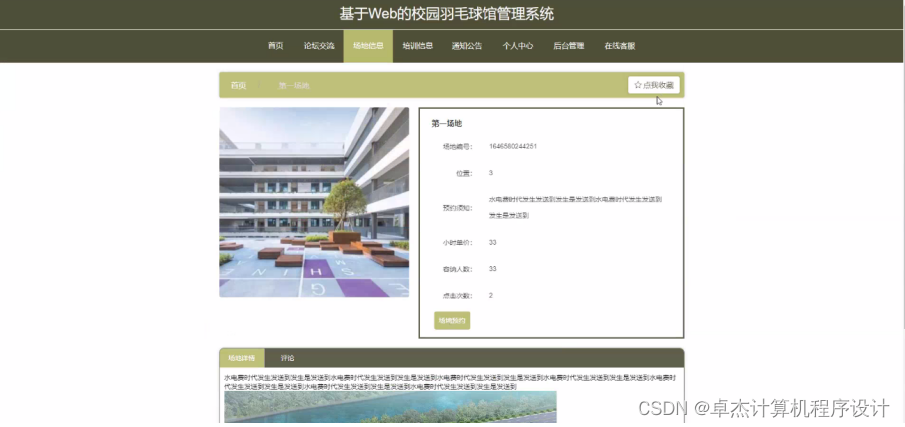 场地信息,用户可在场地信息页面查看场地名称、场地编号、位置、预约通知、小时单价、容纳人数、点击次数、评论等内容,还可进行收藏或预约等操作,如图5-5所示。