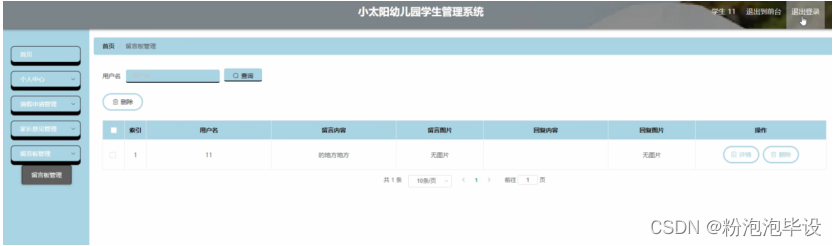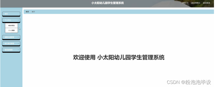 学生登录进入小太阳幼儿园学生管理系统可以查看首页,个人中心,请假申请管理,家长意见管理,留言板管理等内容进行详细操作,如图5-17所示。