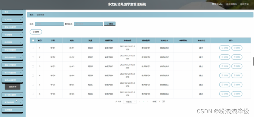 请假申请管理,在请假申请管理页面可以对索引,学号,姓名,班级,请假天数,申请时间,教师账号,教师姓名,审核回复,审核状态等内容进行详情删除等操作,如图5-12所示。