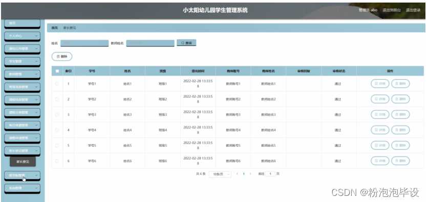 家长意见管理,在家长意见管理页面可以对索引,学号,姓名,班级,提出时间,教师账号,教师姓名,审核回复,审核状态等内容进行详情,删除等操作,如图5-13所示。
