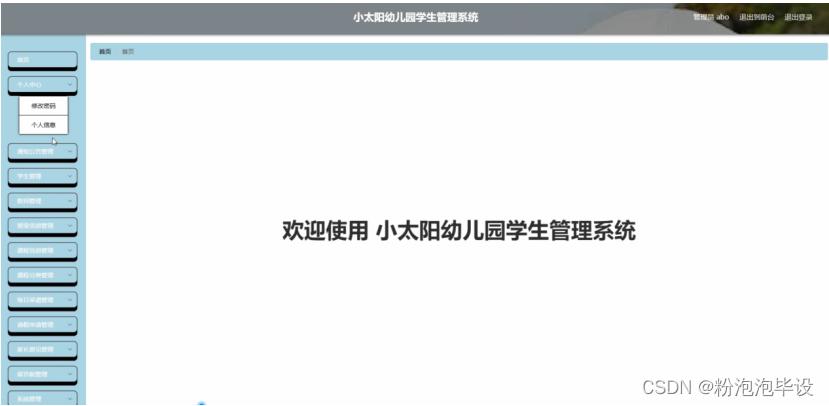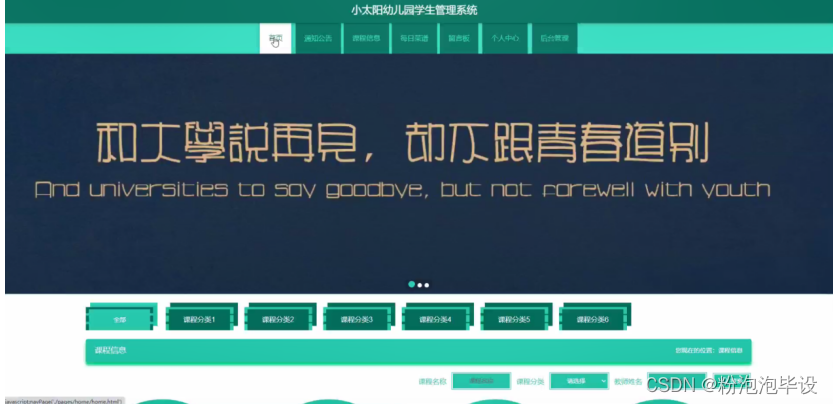 小太阳幼儿园学生管理系统,在系统首页可以查看首页,通知公告,课程信息,每日菜谱 ,留言板,个人中心,后台管理等内容进行详细操作,如图5-1所示。