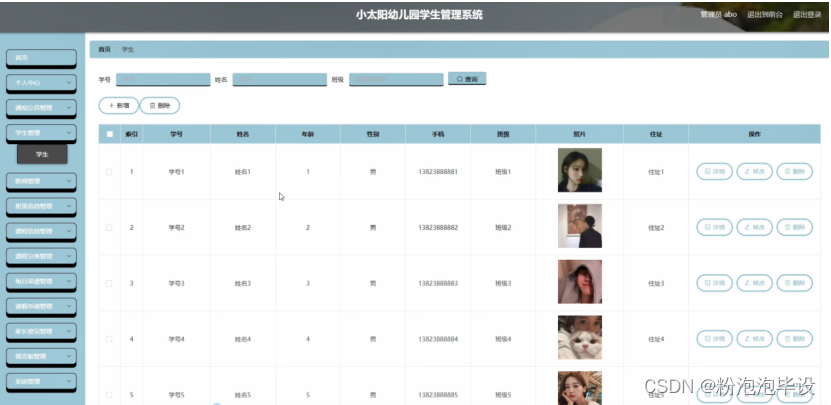 学生管理,在学生管理页面可以对索引,学号,姓名,年龄,性别,手机,班级,图片,地址等内容进行详情,修改或删除等操作,如图5-7所示。