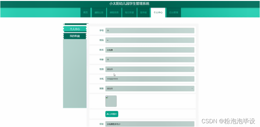 个人中心,在个人中心页面可以查看学号,密码,姓名,年龄,性别,手机,班级,上传图片,住址等详细信息,如图5-3所示。