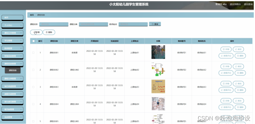 管理员登录进入小太阳幼儿园学生管理系统,可以查看首页,个人中心,通知公告管理,学生管理,教师管理,班级信息管理,课程信息管理,课程分类管理,每日菜谱管理,请假申请管理,家长意见管理,留言板管理,系统管理等内容进行详细操作,如图5-5所示。