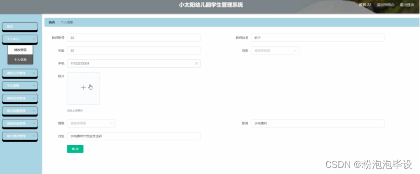 个人中心,在个人信息页面通过填写教师账号,教师姓名,年龄,性别,手机,照片,班级,职务,住址等内容进行个人信息修改操作,如图5-15所示。