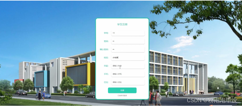 学生注册,在学生注册页面可以填写学号,密码,学生密码,姓名,年龄,手机,住址等内容进行注册,如图5-2所示。