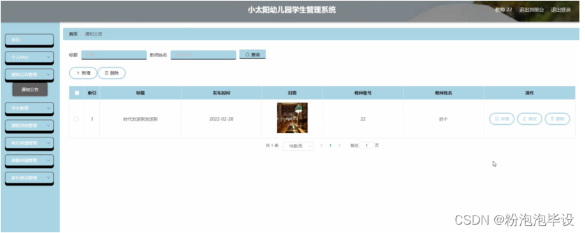 通知公告管理,在通知公告管理页面可以对索引,标题,发布时间,封面,教师账号,教师姓名等内容进行详情,修改或删除等操作,如图5-6所示。
