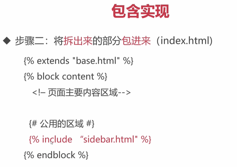 1)在通用模板上,通过 {% block 部分名称%}{% endblock %} 将可变的部分圈出来;图示步骤一,使用block将可变的部分圈出来,命名为content。