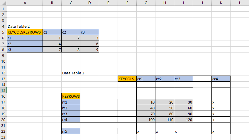 - >>> {'keyrows': ['r1', 'r2', 'r3'], 'keycols': ['c1', 'c2', 'c3'], 'data': [[1, 2, 3], [4, '', 6], [7, 8, 9]]}