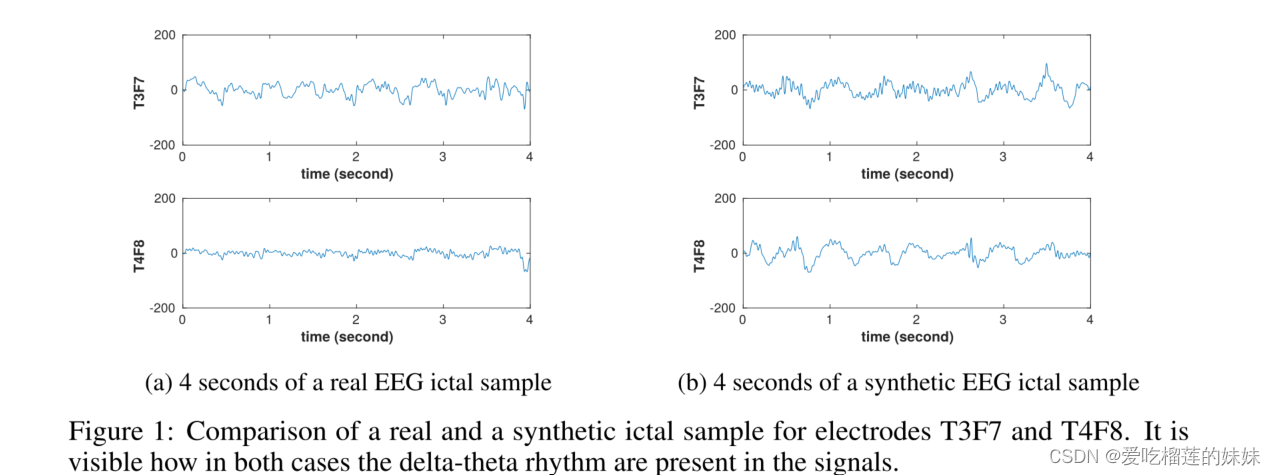 图1:电极T3F7和T4F8的真实和合成发作样本的比较。可以看出在这两种情况下δ-θ节律是如何出现在信号中的。