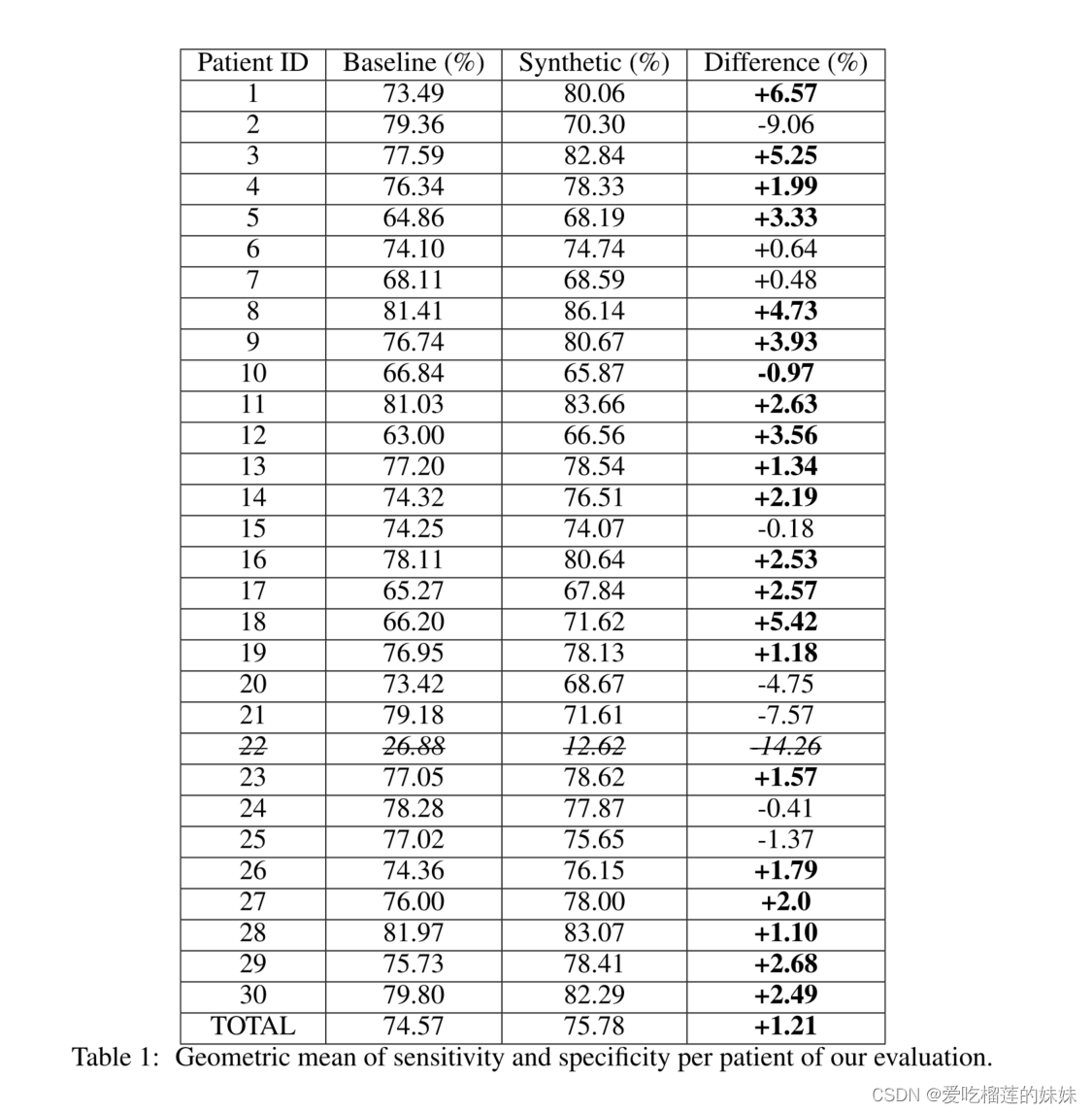 表1包含我们实验的每个患者的结果。患者22对于基线和合成训练集的表现都非常差,因此,它不是分类质量的相关指标。因此,它已从性能总差异的计算中移除。该总差异计算为合成病例中所有患者的几何平均值与基线病例中所有患者的几何平均值之间的差异。当患者22已经被排除时,这些结果通过了具有0.0098的p值的Wilcoxon统计显著性检验,这表明基线和合成训练集获得的结果之间的差异在统计上是显著的。