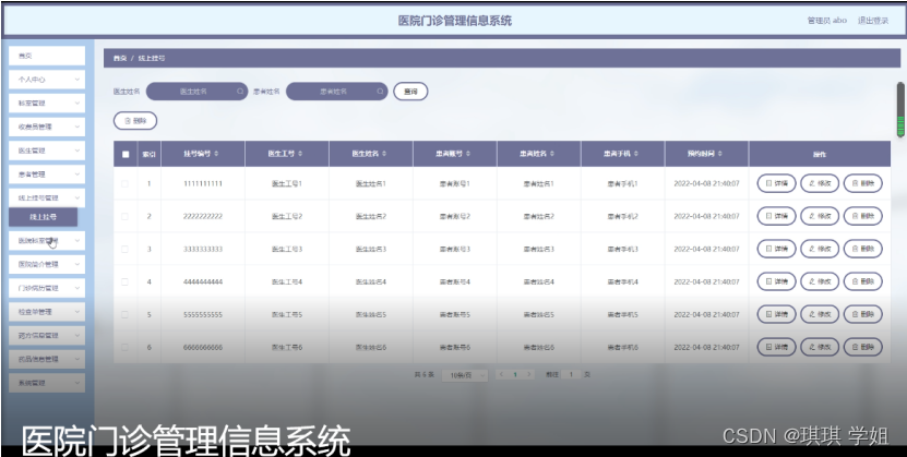线上挂号管理,在线上挂号页面可以对索引,挂号编号,医生工号,医生姓名,患者账号,患者姓名,患者手机,预约时间等内容进行详情,修改和删除等操作,如图5-12所示。