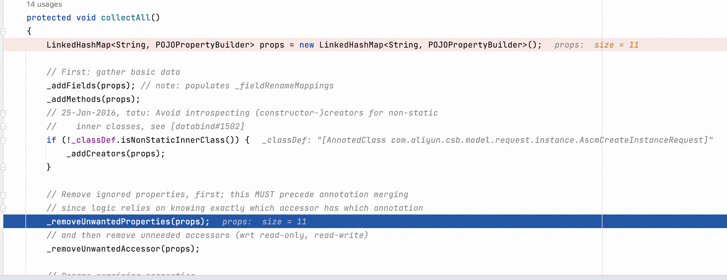 值得注意的是,这是一个懒加载的类,内部的分析逻辑只有在第一次被用到时才会执行。分析逻辑在 POJOPropertiesCollector.collecAll()这个方法里面。