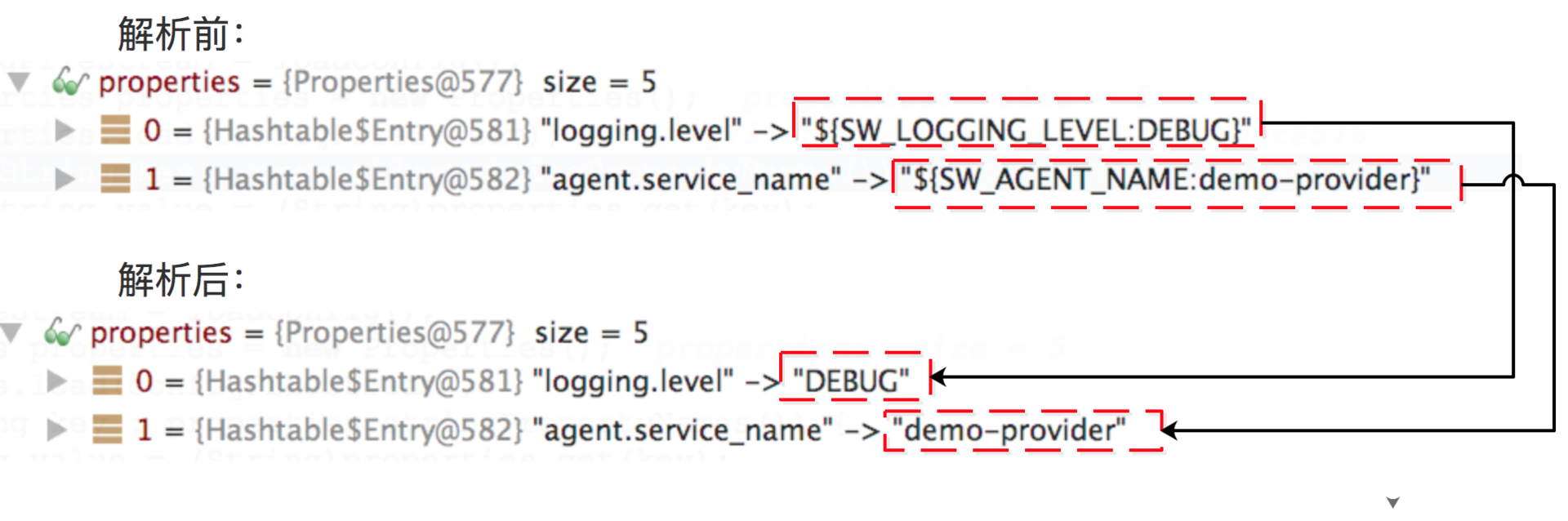 将 agent.config 文件中的配置信息加载到 Properties 对象之后,将使用 PropertyPlaceholderHelper 对配置信息进行解析,将当前的“${配置项名称:默认值}”格式的配置值,替换成其中的默认值,demo-provider 解析结果如下图所示: