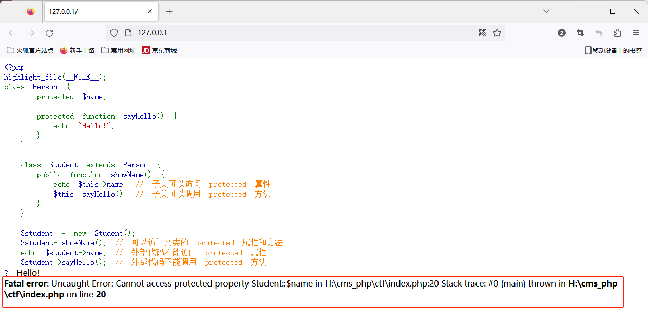$student->sayHello(); // 外部代码不能调用 protected 方法 会显示错误