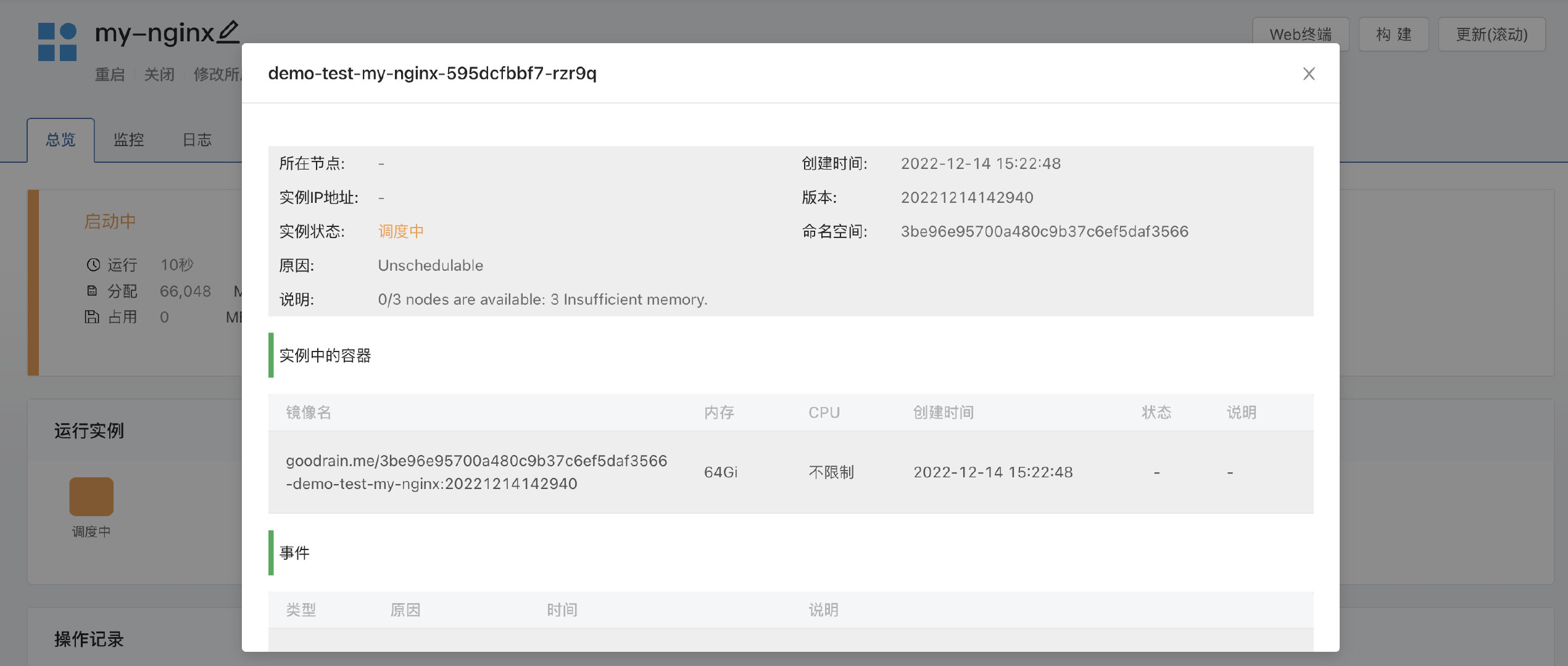 当所有的计算节点都没有足够的内存资源来调度业务系统的 Pod 时,事件信息是这样的: