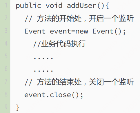 我们知道⼀个事件是⼀个时间段内系统执⾏的若⼲动作,所以对于事件捕捉必须包含开启监听和结束监听两个动作?如果⼀个事件在⼀个⽅法内完成的,这个问题是⽐较好解决的,我们只要在⽅法的开始创建⼀个Event对象,在⽅法结束时调⽤该对像的close ⽅法即可。