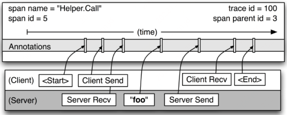 以上这些埋点在 Dapper 中有个专业的术语,叫做 Annotation。如果 Dapper 论⽂中的图示你还没有看太懂的话,那么可以再看看下⾯这张图,⽐较清楚的展示出整个过程。
