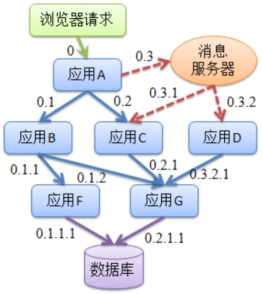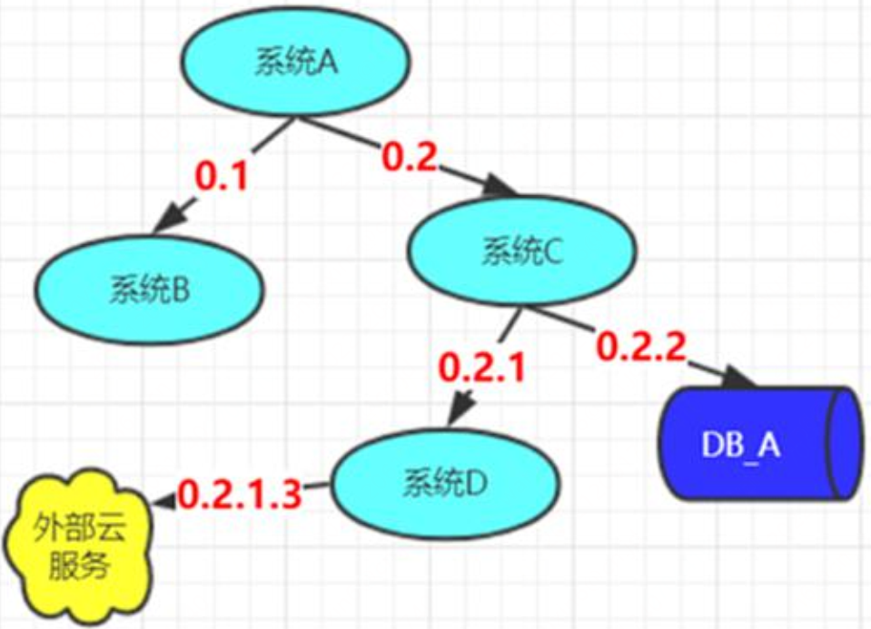 由跟踪的起点⽣成初始SpanId,每捕捉⼀个事件ID加1,每传递⼀次,层级加1。