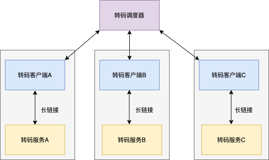 将转码角色分为三部分:调度器 ,客户端,转码服务 ,转码服务是 worker ,负责执行任务即可,调度器会将不同的任务分配到不同的服务器上,客户端会上报每个转码服务的状态,当转码服务出现问题时,调度器可以通过客户端重启/关闭/暂停转码服务,在调度任务的过程中,需要保证任务消息不丢失。