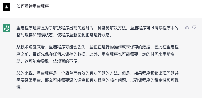 最近 ChatGPT 大火,我也尝试让他回答“如何看待重启程序” 这个问题。