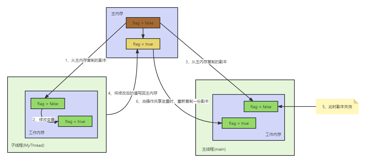- 每个线程都有自己的工作内存,所需要的变量是主内存中的副本。