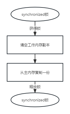 加了synchronized锁,首先该线程会获得锁对象,接着会去清空工作内存,再从主内存中copy一份最新的值到工作变量中,接着执行代码, 打印输出,最后释放锁。