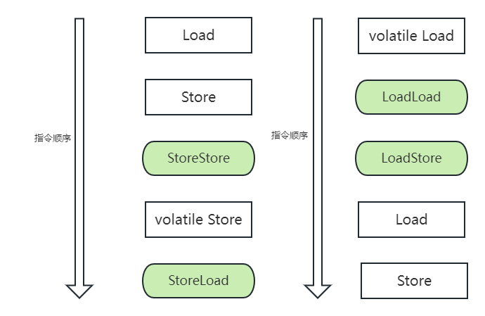 在volatile修饰的变量进行写操作时候,会使用StoreStore屏障和StoreLoad屏障,进行对volatile变量读操作会在之后使用LoadLoad屏障和LoadStore屏障。