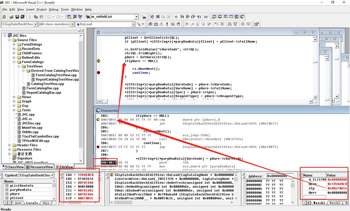 图中分别列出了源代码与反汇编代码窗体,同时也列出了寄存器窗口与右下角的变量观察辅助对话框