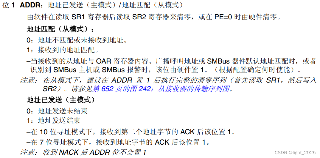 使用I2C外设进行通讯时,在通讯的不同阶段它会对“状态寄存器“(SR1及SR2)”的不同数据位写入参数,通过读取这些寄存器标志来了解通讯状态。