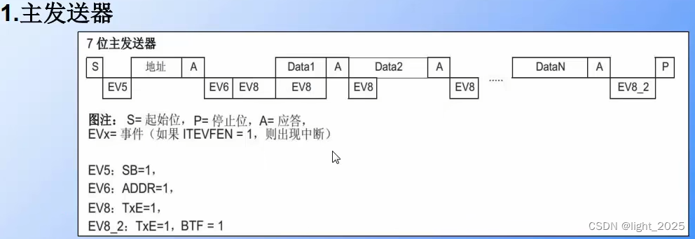 首先S起始位,发送通讯开始命令,状态寄存器SR就会产生EV5事件,置位0 SB=1;表示起始位已经发送。