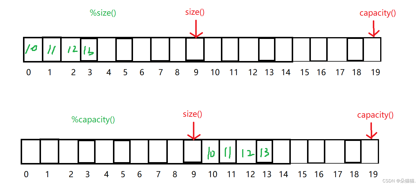 上面是哈希表插入的代码,我们先不考虑扩容的问题,在这里我们计算插入元素映射的位置一定不能%capacity(),我们画个图为例: