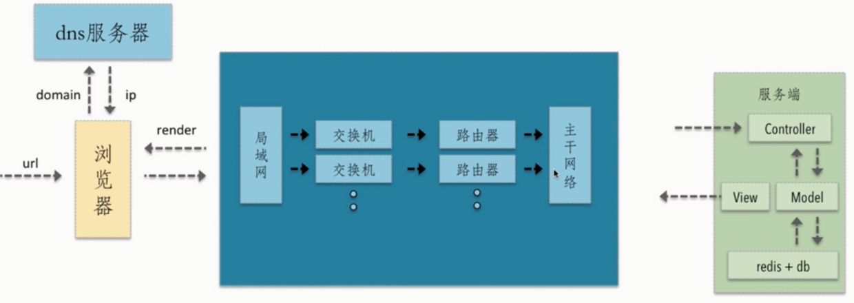 至于这一阶段发生什么?简而言之,首先浏览器发送过来的请求先经过控制器,控制器进行逻辑处理和请求分发,接着会调用模型,这一阶段模型会获取 redis db 以及 MySQL 的数据,获取数据后将渲染好的页面,响应信息会以响应报文的形式返回给客户端,最后浏览器通过渲染引擎将网页呈现在用户面前。
