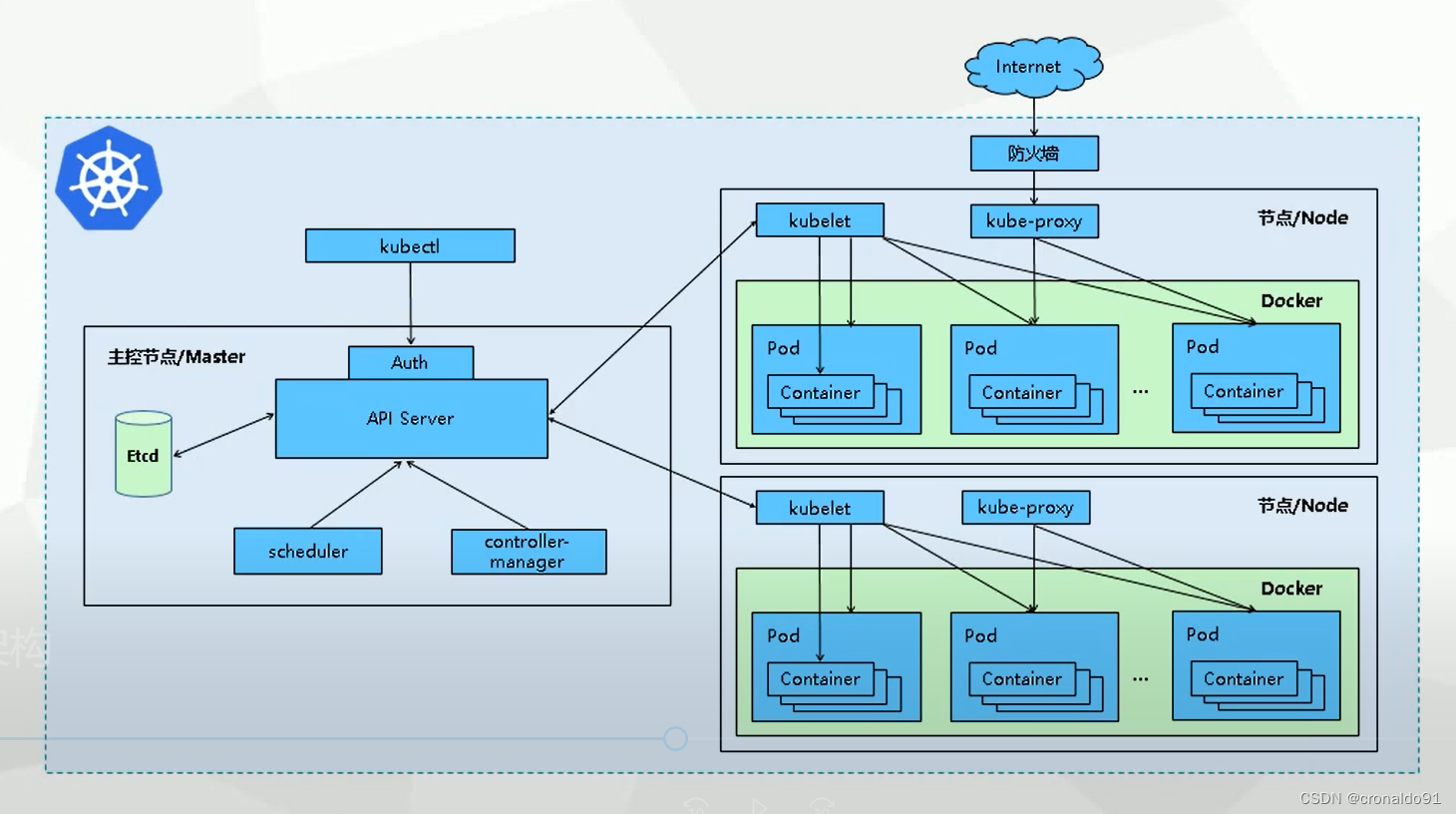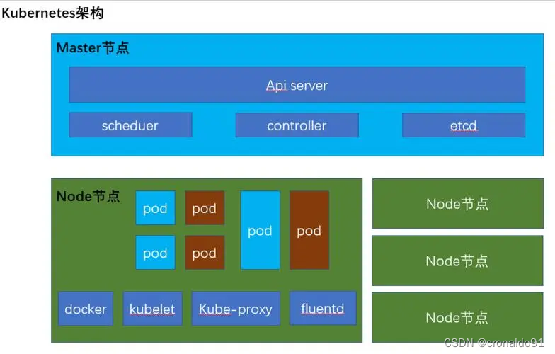 在K8S中,主节点一般被称为Master 节点,而从节点则被称为Worker Node 节点,每个Node 都会被Master 分配一些工作负载。